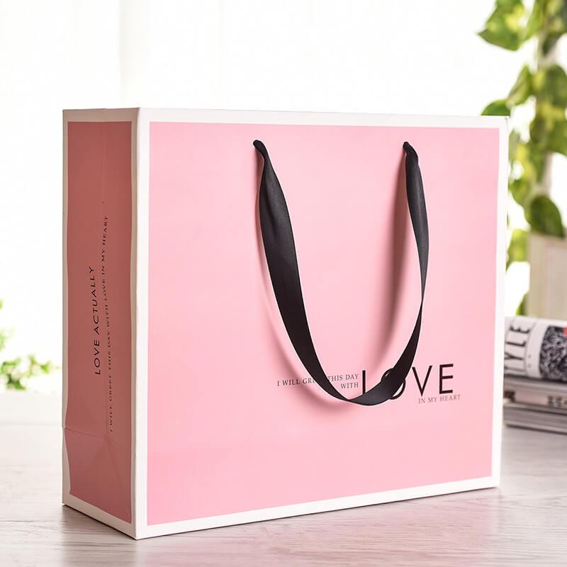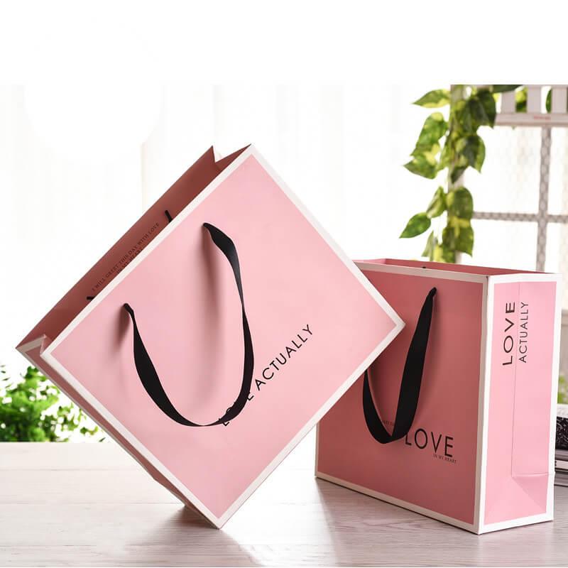 This logo printed pink shopping paper bag is made of white cardboard , which is reusable, compostable, recyclable. Suitable for shopping, gift packaging, clothing packaging, ect.